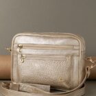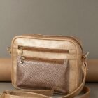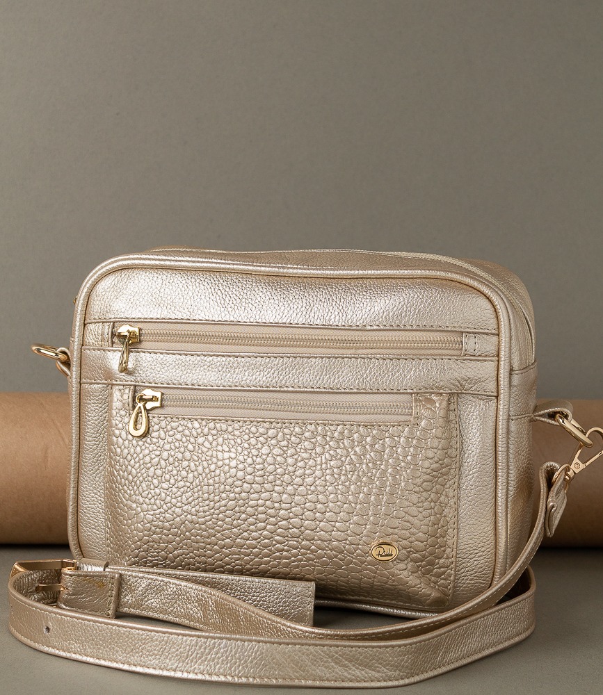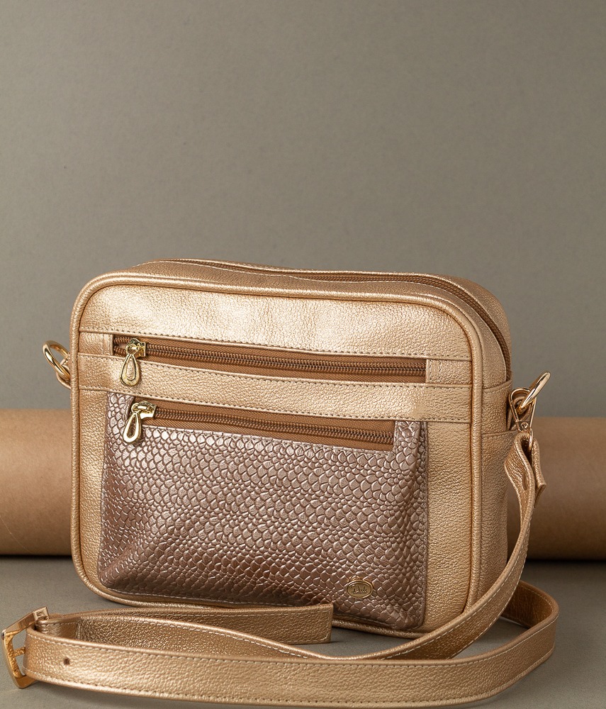 Material de cuero con textura suave; la parte frontal incluye un bolsillo con textura que añade un toque de moda y contraste visual. Cuenta con bolsillo delantero con cremallera, perfecto para objetos que necesitas a mano (celular, llaves, tarjetas); bolsillo principal con cremallera amplio para guardar tus esenciales diarios (billetera, maquillaje, gafas, etc.); cremalleras metálicas doradas que suman un detalle elegante y seguro; correa larga ajustable para llevar cruzado o al hombro, lo que aporta comodidad y versatilidad durante todo el día. El tamaño mediano lo bastante espacioso para el día a día, sin ser voluminoso.