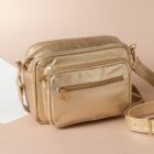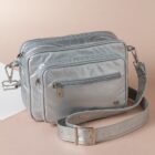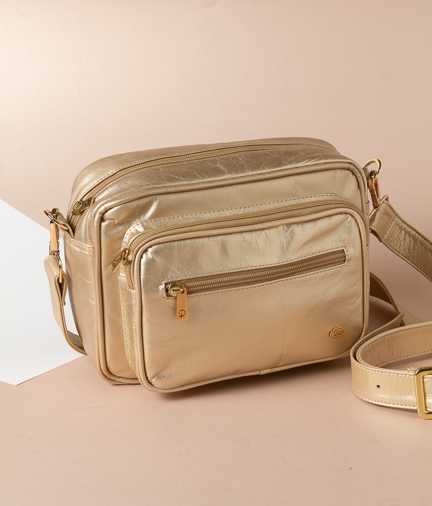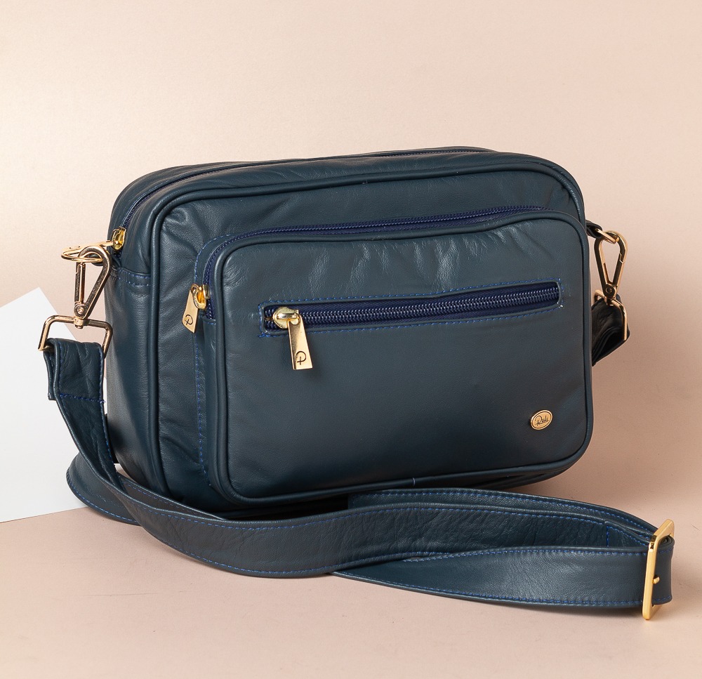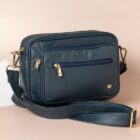 Cuenta con varios compartimientos con cierre de cremallera, incluyendo un bolsillo frontal amplio y otro más pequeño, ideales para mantener los objetos personales organizados. Su correa ajustable permite usarlo cómodamente como bolso cruzado o al hombro.