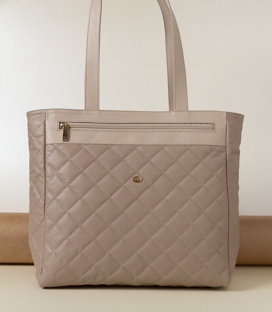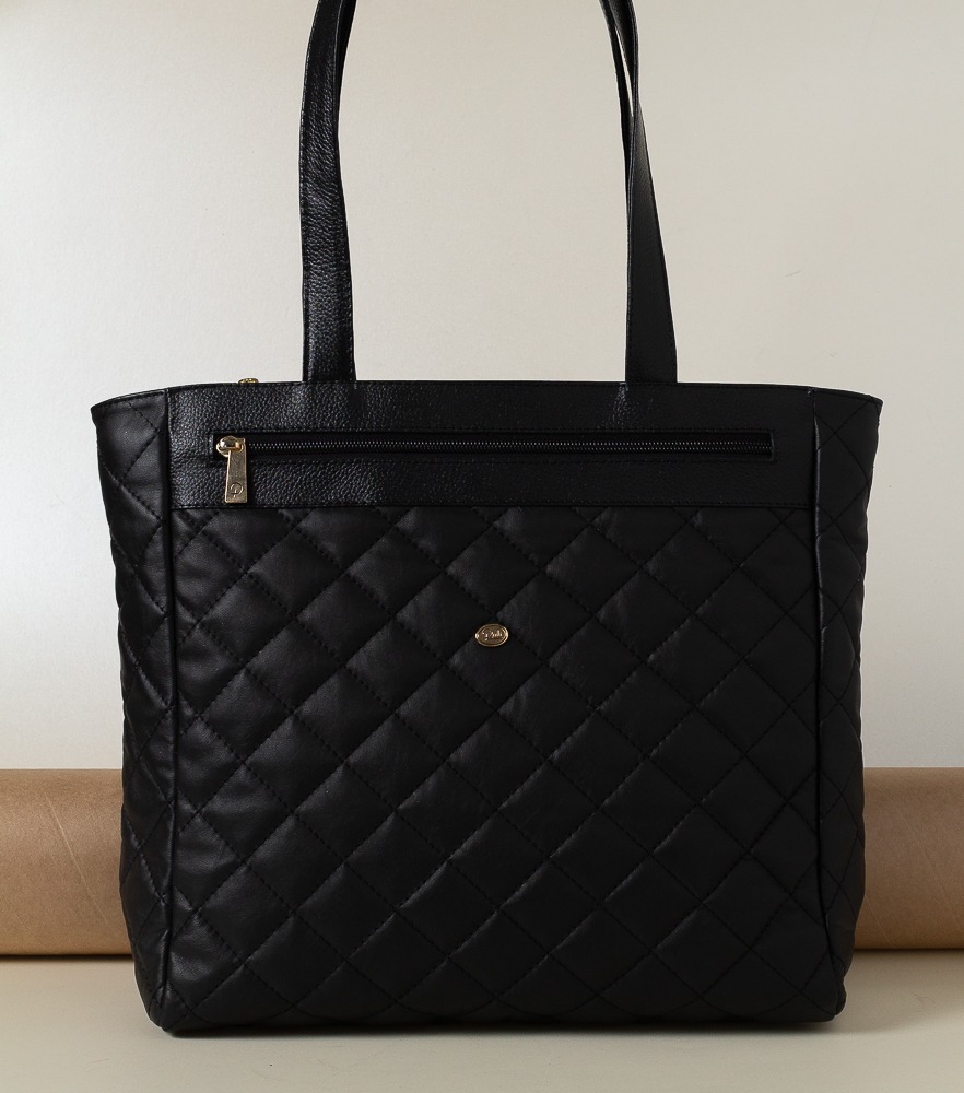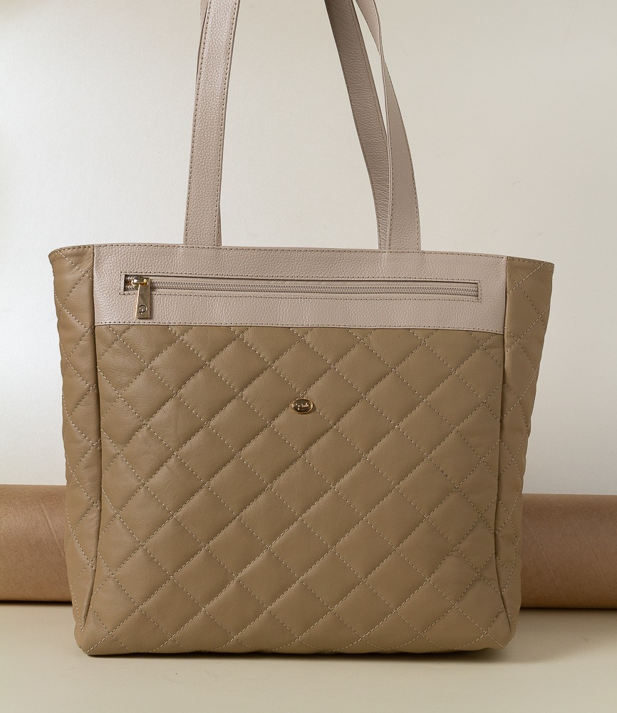 Bolso para dama elaborado en cuero, de diseño elegante y funcional. Presenta un acabado acolchado con patrón de rombos en la parte frontal, que le aporta un estilo sofisticado y moderno y lo hace versátil y fácil de combinar con distintos atuendos.