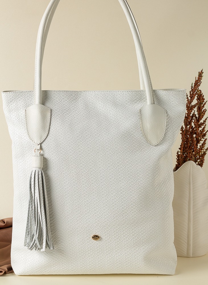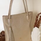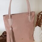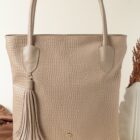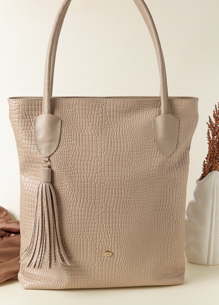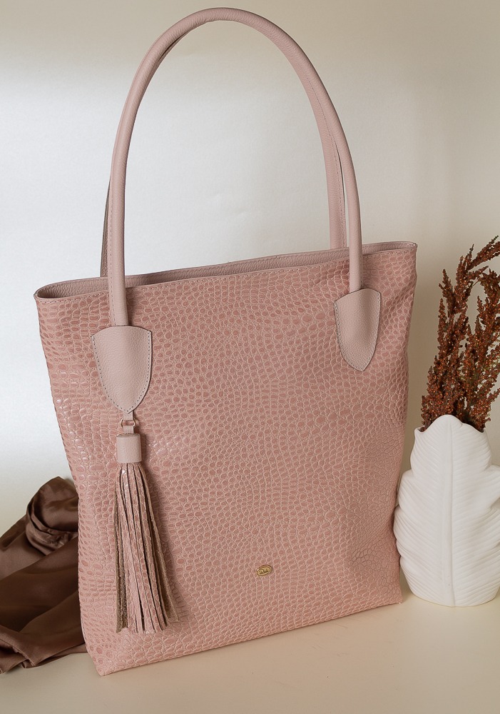 Cuenta con asas largas y firmes para llevar al hombro, detalles reforzados en las uniones y un delicado accesorio de borla colgante que realza su estilo femenino y moderno. Su tono rosa nude lo hace versátil y fácil de combinar con looks formales, ejecutivos o casuales.