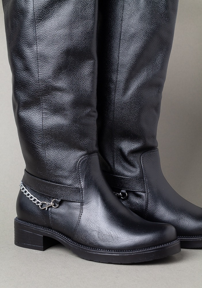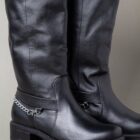 El modelo incorpora un detalle decorativo de cadena metálica plateada en la parte baja de la caña, unido con pequeñas argollas que agregan un toque sofisticado y distintivo sin perder sobriedad. La punta es redonda y suave, brindando comodidad al caminar, mientras que la suela de tacón bajo y robusto asegura estabilidad y durabilidad en el uso diario.
