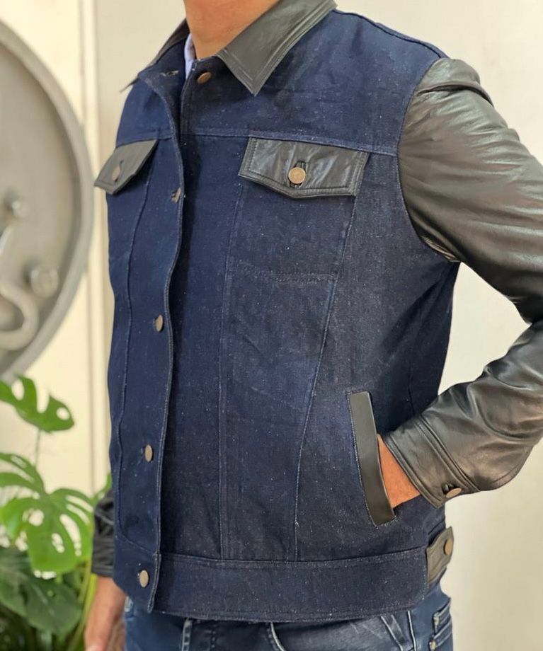 Chaqueta de cuero para hombre o cuero combinada con tela de jean, que fusiona lo mejor de ambos materiales en un diseño moderno y versátil. Confeccionada en cuero o en una mezcla de cuero de alta calidad y tela de jean duradera, esta chaqueta ofrece una textura suave y resistente con un estilo único. Los botones metálicos añaden un toque clásico y elegante, mientras que la combinación de materiales proporciona un contraste atractivo y contemporáneo. El diseño incluye un corte ajustado que realza la figura, bolsillos funcionales y detalles de costura precisos, ideal para un look casual y sofisticado que se adapta a diversas ocasiones. Perfecta para quienes buscan un estilo audaz y funcional.