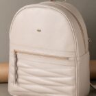 Cuenta con un compartimento principal amplio y un bolsillo frontal con cierre, que añade un contraste elegante y funcionalidad para objetos de fácil acceso. El frente presenta costuras decorativas en patrón diagonal, que realzan su estilo contemporáneo.
