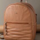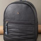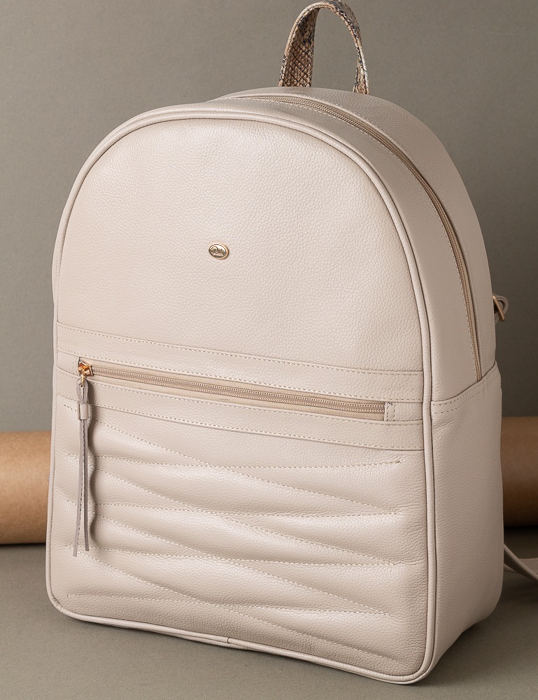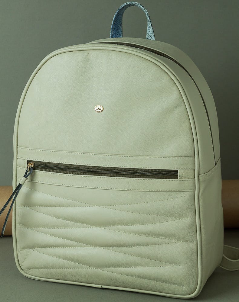 Incluye detalles en cuero con textura tipo reptil en el bolsillo frontal y en el tirador del cierre, aportando un toque distintivo. El asa superior y las correas ajustables permiten un transporte cómodo y versátil.