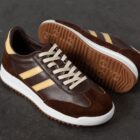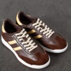 Tenis para dama elaborados en cuero de alta calidad en tono café, combinados con detalles en gamuza que aportan textura y un estilo sofisticado. Su diseño moderno con franjas laterales en color beige crea un contraste elegante y versátil, ideal para complementar looks casuales o urbanos.
