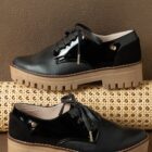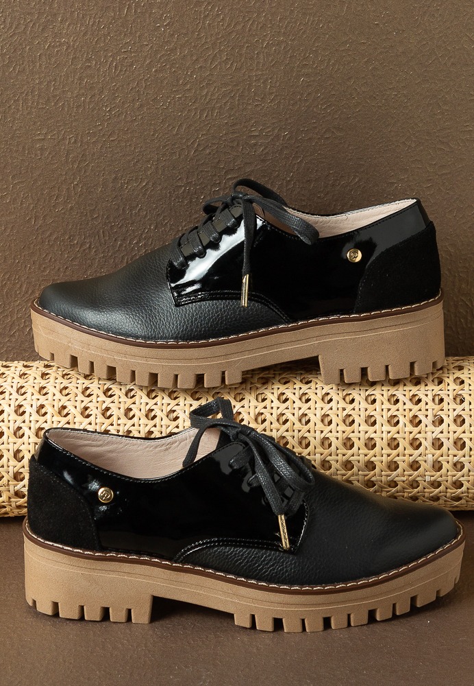 Elegante y moderno zapato tipo oxford para dama, confeccionado en cuero de alta calidad. Combina materiales en tonos talco y café moca. El diseño incluye cordones ajustables con terminaciones metálicas doradas, que añaden un toque de sofisticación. La suela gruesa tipo track, en tono beige, ofrece excelente tracción y comodidad, ideal para el uso diario. Perfecto para looks casuales o smart-casual.