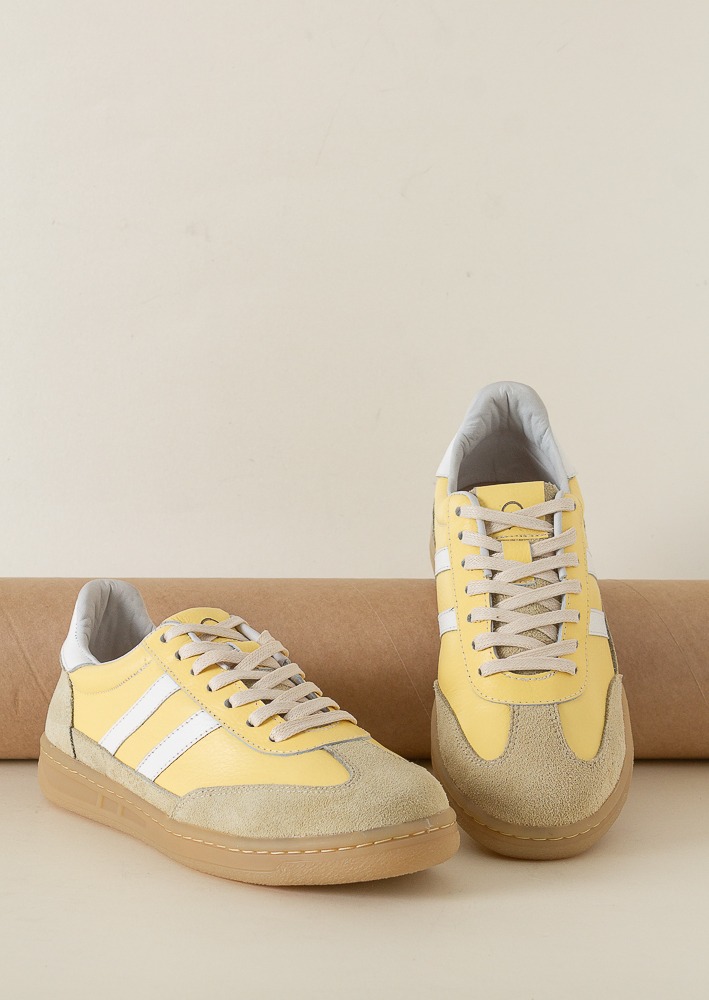 Estos zapatos para dama están confeccionados en cuero de alta calidad, combinando estilo y comodidad en un diseño moderno y versátil. Presentan un acabado en tono amarillo suave que aporta frescura y originalidad, complementado con detalles en blanco como las franjas laterales y la parte trasera.