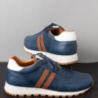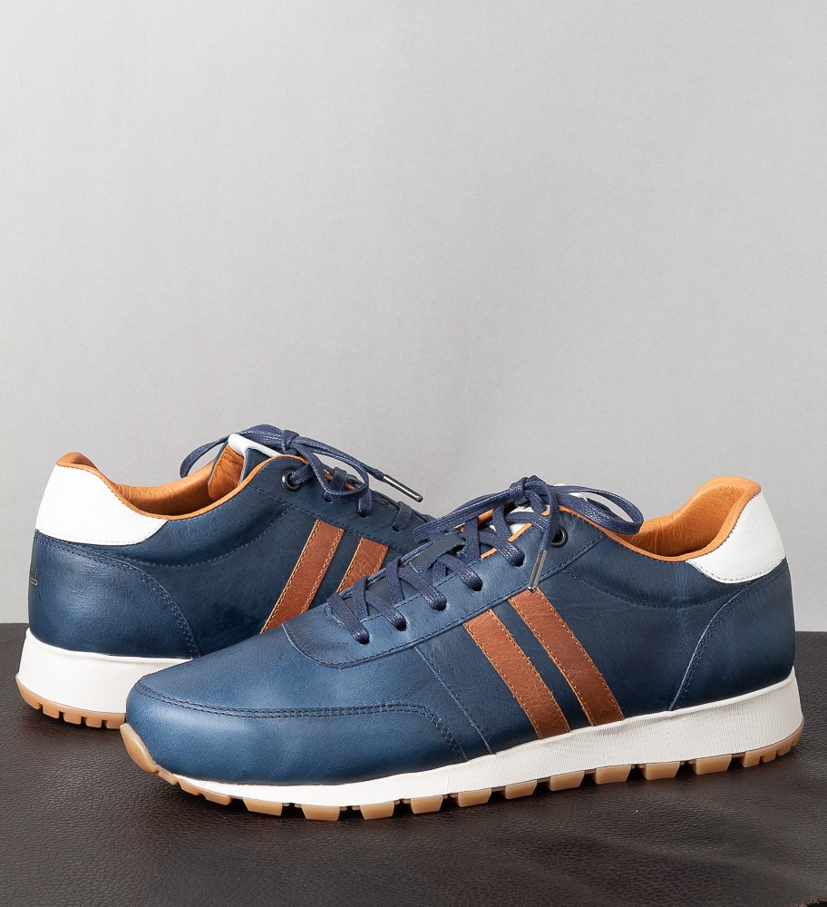 Estos elegantes zapatos de cuero para hombre combinan un diseño retro-deportivo con una estética sofisticada. Confeccionados en cuero azul profundo, ofrecen una textura lisa y resistente que garantiza durabilidad y estilo. Las líneas marrones laterales contrastan de forma armónica, aportando un toque clásico y masculino, mientras que la parte posterior en blanco añade un aire moderno y equilibrado.